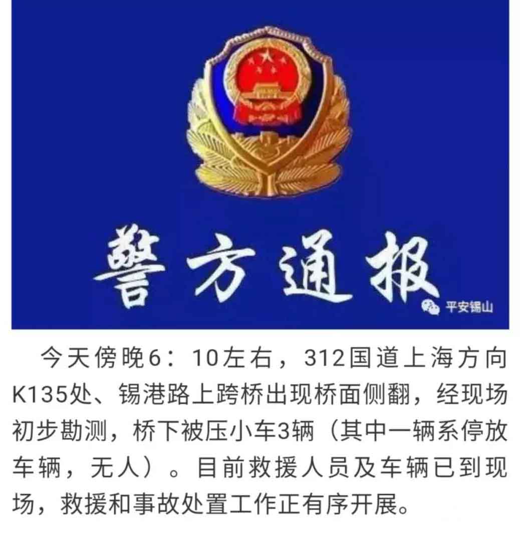 記者從無錫市錫山區(qū)警方獲悉,10月10日下午6:10左右,312國道上海方向K135處、錫港路上跨橋出現(xiàn)橋面?zhèn)确鹿?,?jīng)現(xiàn)場初步勘察,橋下被壓小車3輛(其中一輛系停放車輛,無人)。目前救援人員及車輛已到現(xiàn)場,救援和事故處置工作正有序開展。