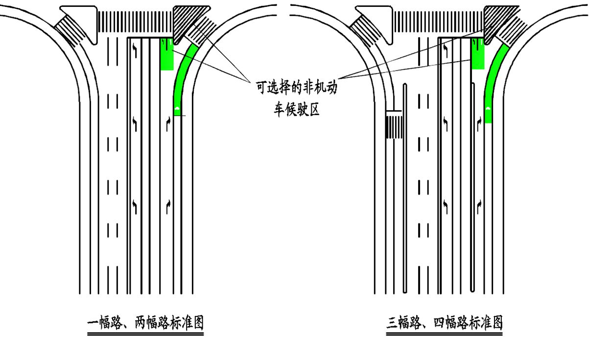 (2)三環(huán)外及三環(huán)內(nèi)特殊路段:因大型貨車(chē)、客車(chē)通行需求較多,對(duì)車(chē)道寬度要求較高時(shí),可對(duì)交叉口進(jìn)口車(chē)道寬度適當(dāng)進(jìn)行增加;