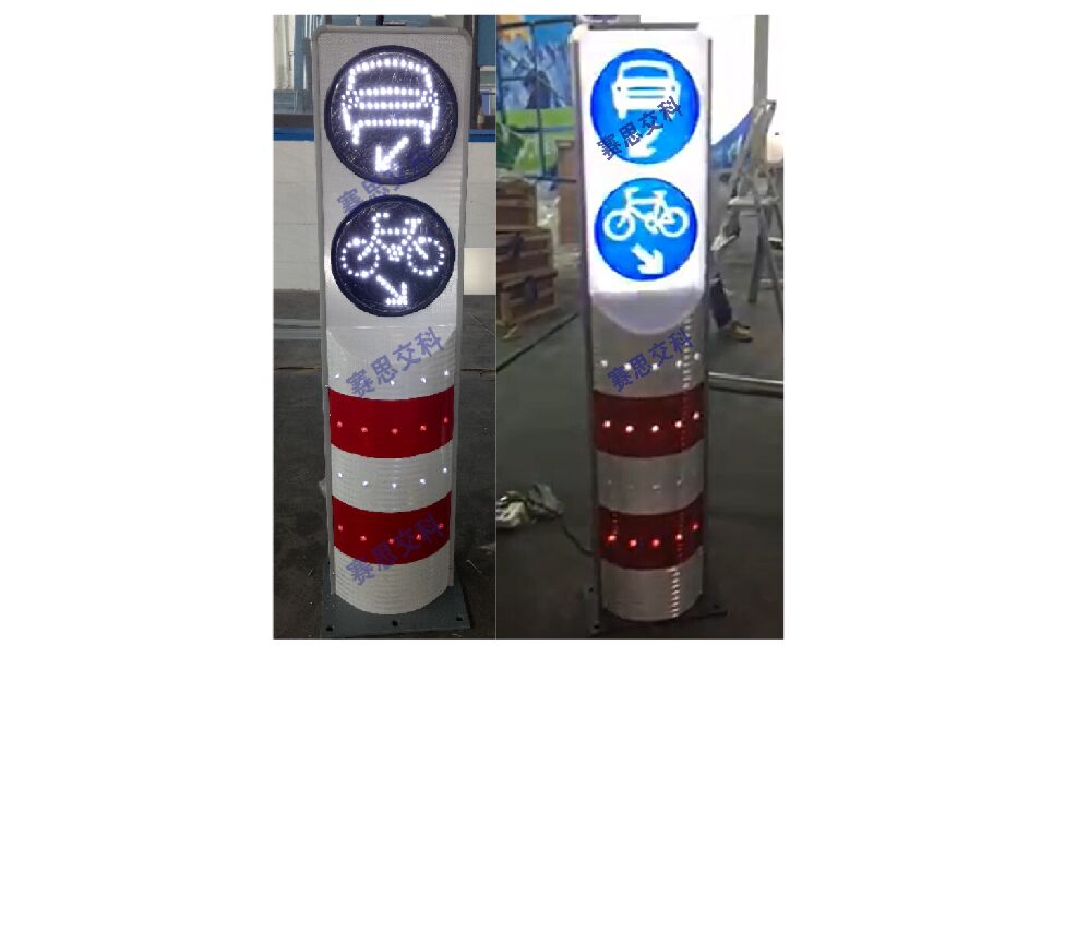 2、基本說明:一體式柱體結(jié)構(gòu),標(biāo)志版面圖案中設(shè)置紅滿屏燈、紅滿屏燈,交替閃爍,柱體上設(shè)置警示發(fā)光管,采用太陽能蓄電池供電,設(shè)置于危險(xiǎn)路段分道、高架匝道上下口等。