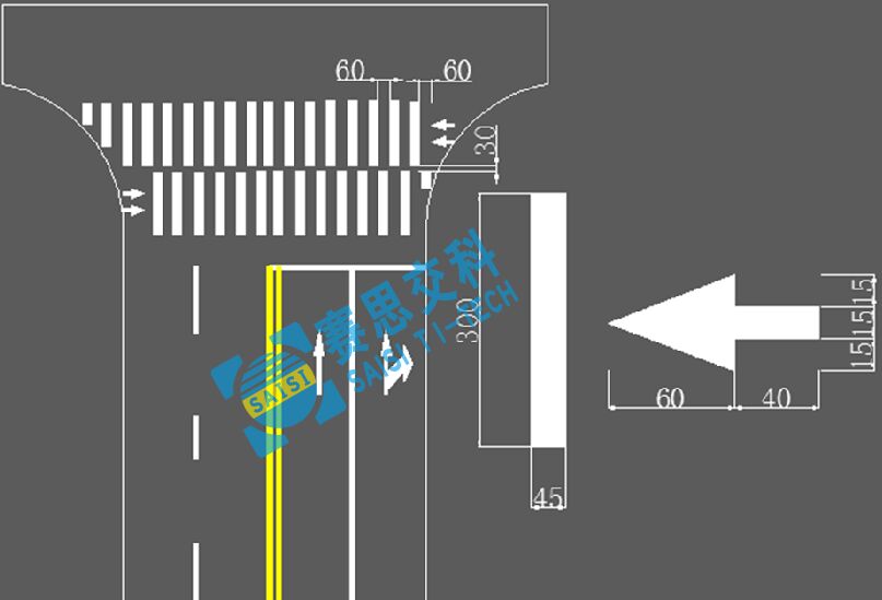為提高人行橫道的通行秩序與效率,在具備可施劃6m寬度人行橫道線的條件下,可采用導向式人行橫道線施劃方式,線寬為45cm,兩段線長都為3m,兩段線間隔30cm,實空對稱交錯施劃,在人行橫道線的兩端按照靠右通行的習慣添加導向箭頭,具體尺寸如下圖所示。