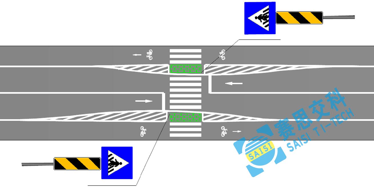 通過增設實體安全島及上游車道寬度進行壓縮,強制車輛減速行駛,提高行人過街的安全性。兩端設置人行橫道指示標志,建議采用主動發(fā)光工藝,提升標志的遠距離視認性,和動態(tài)警示性。