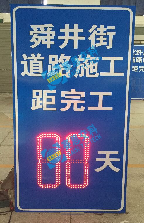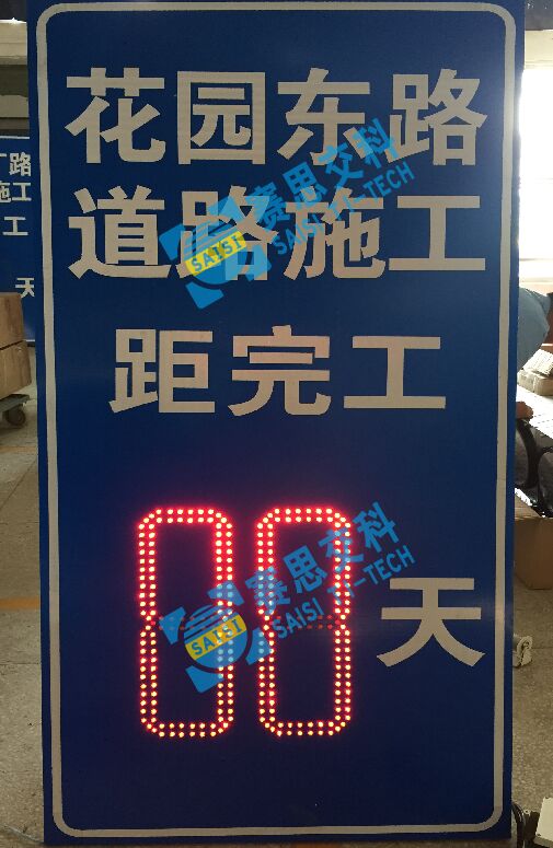 1、工藝說明:在標志版面中嵌入“8”字型LED發(fā)光條碼,可根據(jù)需要設(shè)置組數(shù)(個位、十位、百位),自動校正時間節(jié)點,動態(tài)發(fā)光顯示剩余天數(shù),有效告知施工區(qū)作業(yè)時間。