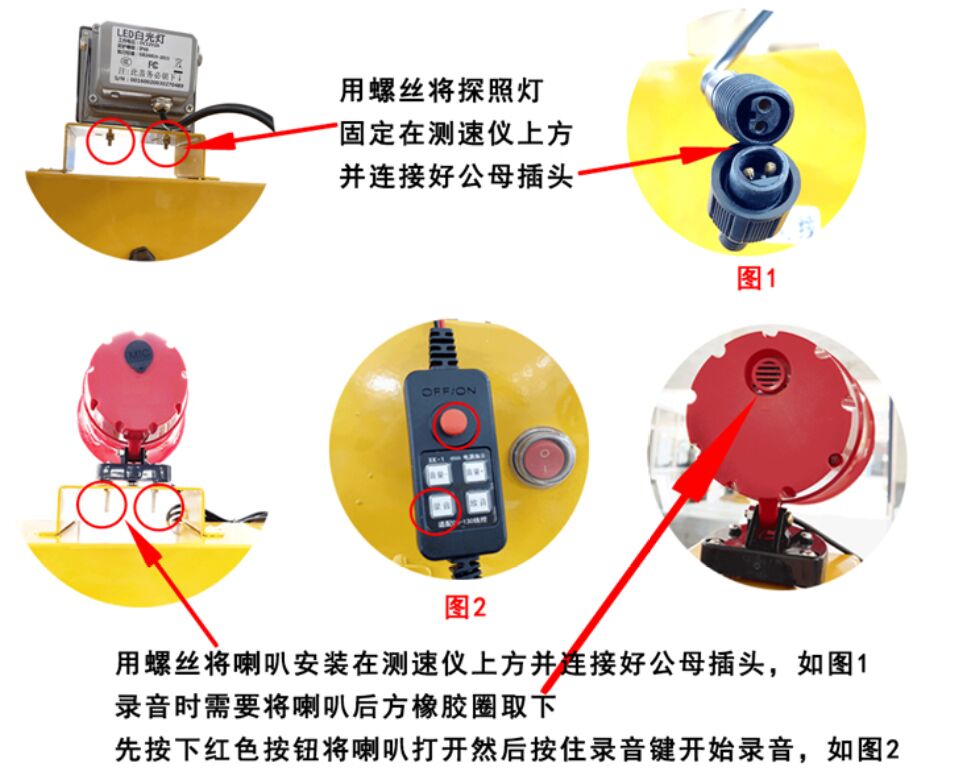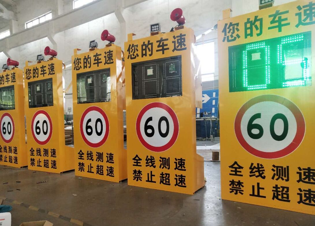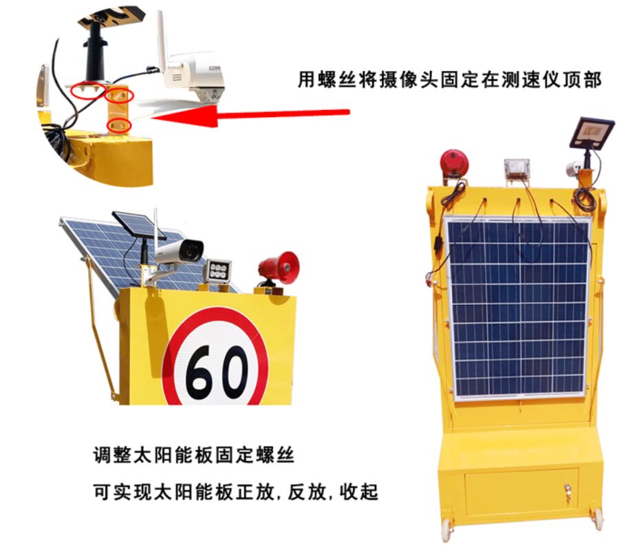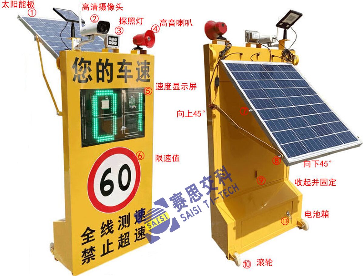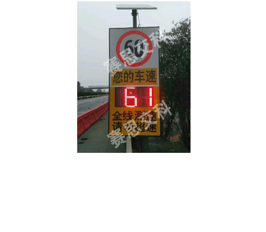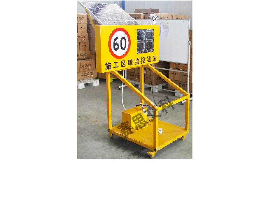 1、標(biāo)志整體為立體裝置平臺,主要包括:語音警示喇叭、速度條碼顯示屏、視頻記錄攝像頭、太陽能蓄電池供電系統(tǒng)等設(shè)備。當(dāng)被測車輛通行車速超過限制速度時,速度條碼顯示屏以紅色顯示當(dāng)前車速,并啟動語音警示喇叭告知車輛以超速行駛;當(dāng)被測車輛通行車速超過限制速度時,速度條碼顯示屏以綠色顯示當(dāng)前車速。攝像頭全天候記錄路段動態(tài)視頻,夜間開啟補(bǔ)光燈。該裝置對車輛超速行駛行為有較高的警示效果、特別適用于事故易發(fā)路段、團(tuán)霧頻發(fā)路段、需加強(qiáng)管理路段。