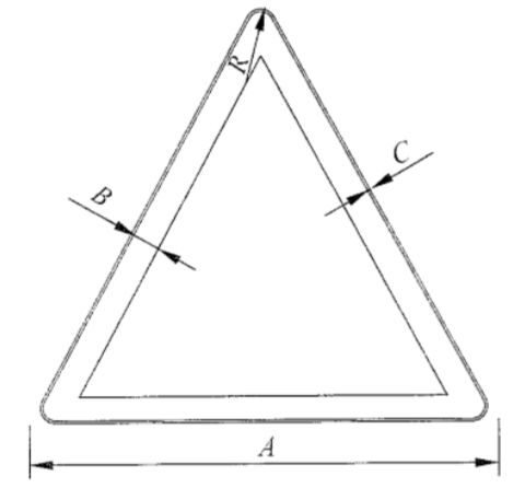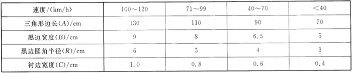 國標《道路交通標志和標線》(GB5768.2)中明確規(guī)定:警告類標志,形狀為正等邊三角型;反光膜顏色為黃、黑主配色;尺寸大小根據(jù)道路設計時速而定,通常有邊長70cm、90cm、110cm、130cm等四種。參考依據(jù)如下圖所示。