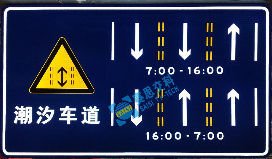 本款潮汐車道發(fā)光標(biāo)志牌,采用半透式主動發(fā)光工藝,標(biāo)志整體采用指示類標(biāo)志版面,依據(jù)國標(biāo)《道路交通標(biāo)志和標(biāo)線》(GB5768-2009)中所列的《潮汐車道標(biāo)志》警告類版面,并對中間車道在不同時間段內(nèi)的通行權(quán)進(jìn)行分配,實現(xiàn)潮汐車道交通秩序的管控。地面應(yīng)當(dāng)配合國標(biāo),施劃潮汐車道地面標(biāo)識。