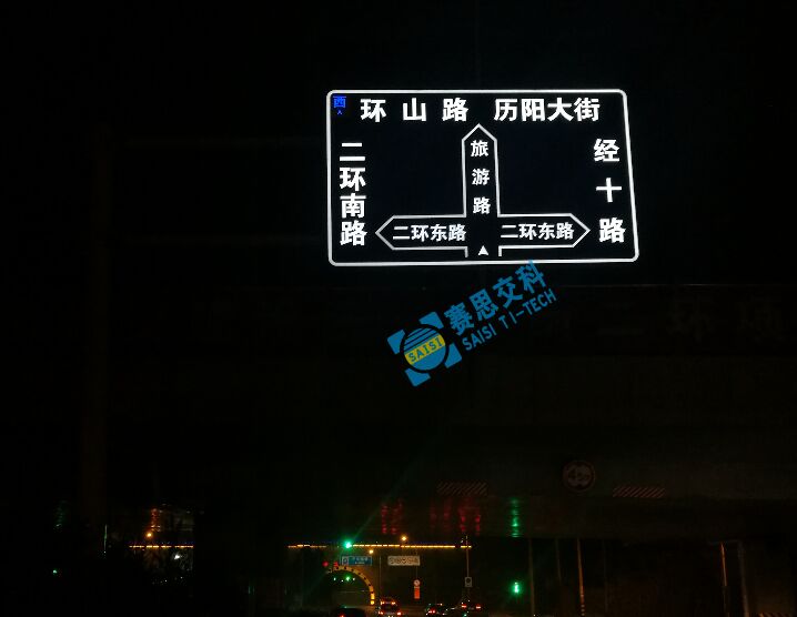指路標(biāo)志,作為道路路名、關(guān)鍵交通節(jié)點(diǎn)的重要指示信息載體,通常設(shè)置于道路交叉口進(jìn)口方向,對(duì)前方交叉口的相交路名信息、遠(yuǎn)點(diǎn)信息進(jìn)行提前的預(yù)告,便于司機(jī)及時(shí)獲取關(guān)聯(lián)道路信息,及時(shí)修正駕駛方向,實(shí)現(xiàn)準(zhǔn)確達(dá)到目的地的行車目標(biāo)。所以指路標(biāo)志具備遠(yuǎn)距離辨認(rèn)性、全天候視認(rèn)性、和在交叉口易發(fā)現(xiàn)性顯得尤其重要,設(shè)計(jì)師在選用半透式主動(dòng)發(fā)光標(biāo)志,正是出于以上的特殊功能性。