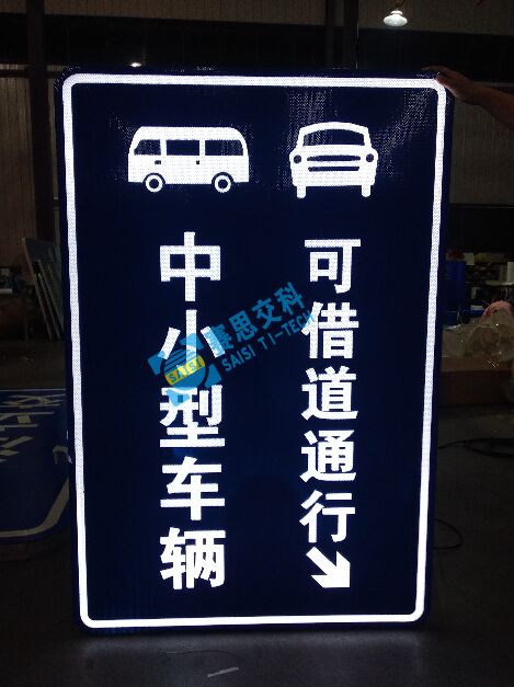 指示標(biāo)志,通常包括:路名(地點(diǎn))確認(rèn)標(biāo)志、道路功能指示標(biāo)志(如:車道行駛標(biāo)志)、道路屬性標(biāo)志(如:非機(jī)動(dòng)車道標(biāo)志)、行駛方向指示標(biāo)志(如:右下行駛標(biāo)志)等。該類標(biāo)志通常版面尺寸較小,但所載信息重要關(guān)鍵。在城市道路中,到處充斥著各種廣告標(biāo)志、宣傳標(biāo)志、店名標(biāo)志等,指示標(biāo)志在其中,常常不易被發(fā)現(xiàn),運(yùn)用半透式主動(dòng)發(fā)光標(biāo)志,使該類標(biāo)志主動(dòng)發(fā)光,在夜晚或光照不佳的環(huán)境中,能主動(dòng)發(fā)光標(biāo)志,極易被捕捉發(fā)現(xiàn),這是交通安全設(shè)計(jì)師非常看重的特殊化功能優(yōu)勢(shì)。