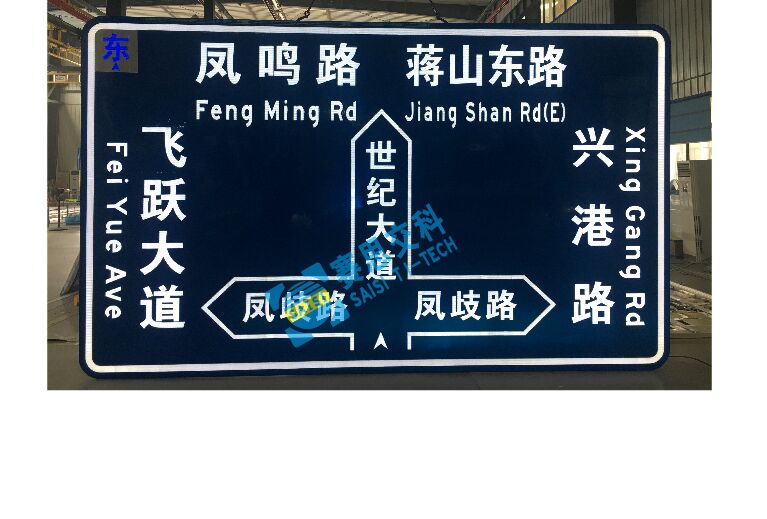 4、指路標(biāo)志 。在道路中,根據(jù)不同道路級別,設(shè)置于交叉口進口方向,通常據(jù)進口車道停止線80—120米范圍內(nèi)。