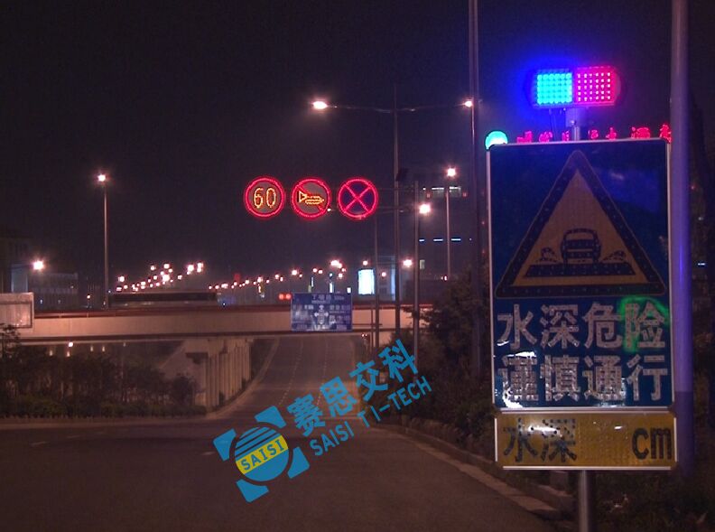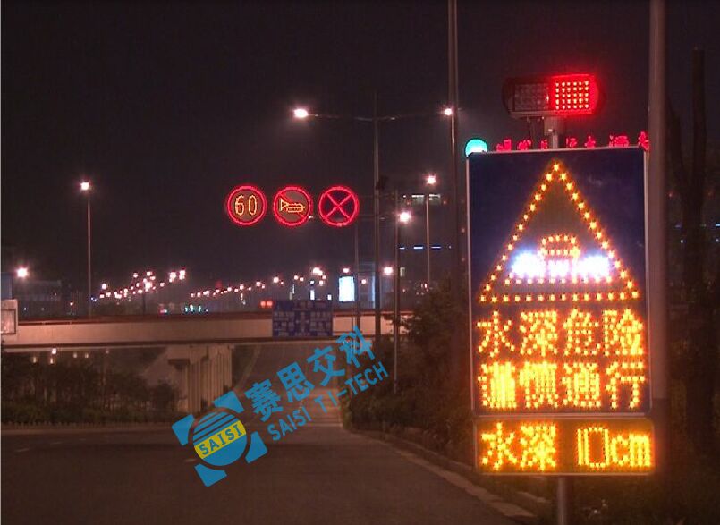 為避免以上情況發(fā)生,降低深積水對(duì)道路通行效率和駕駛安全的影響,賽康交安特開發(fā)本款專門針對(duì)積水路段、區(qū)域的積水自動(dòng)感應(yīng)預(yù)警標(biāo)志系統(tǒng)。本預(yù)警標(biāo)志采用太陽能供電系統(tǒng),通過在低水平區(qū)域預(yù)設(shè)智能水深檢測(cè)探頭對(duì)積水區(qū)進(jìn)行自動(dòng)檢測(cè),并在積水區(qū)域前方預(yù)設(shè)的主動(dòng)發(fā)光警示標(biāo)志中動(dòng)態(tài)顯示積水深度,來告知路段交通參與者前方水深信息,便于提前作出繞道行駛或可以通行的駕駛決策,以提高通行效率和駕駛安全。