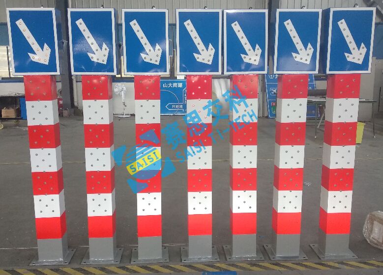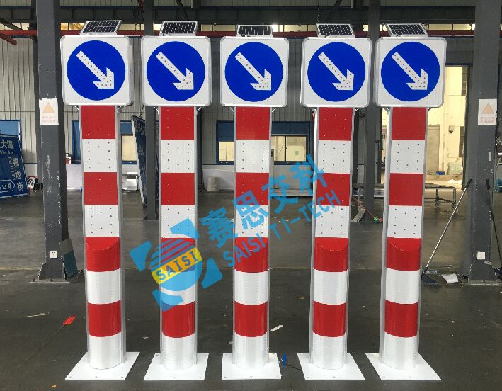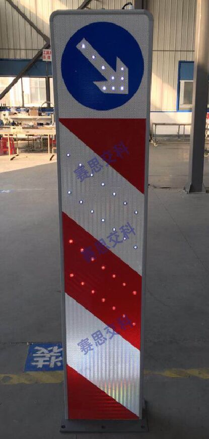 太陽能右下行發(fā)光警示柱(樁),采用外置超高亮LED發(fā)光二極管,對頂部右下行標(biāo)志圖案輪廓進行發(fā)光描邊,且標(biāo)志柱體均設(shè)置斜向紅白相間反光膜,也配置了發(fā)光管,標(biāo)志體整體采用太陽能供電,通過內(nèi)置控制芯片,實現(xiàn)動態(tài)閃爍,或常亮的工作模式,較普通標(biāo)志,具備更強的警示性,和遠(yuǎn)距離視認(rèn)性,經(jīng)測試,太陽能右下行發(fā)光警示柱(樁),在夜晚環(huán)境中,靜態(tài)視覺距離大于400米;動態(tài)視認(rèn)距離大于300米。