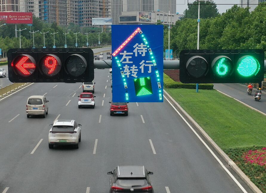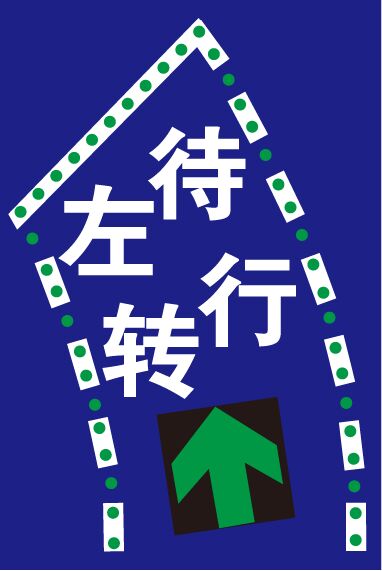 ?2、工藝說明:標(biāo)志版面由LED發(fā)光管組成停車線、邊緣線、“左轉(zhuǎn)待行”文字;由顯示屏動態(tài)(P10)顯示紅、黃、綠三色動態(tài)箭頭,通過控制模塊調(diào)取信號燈燈色狀態(tài),在標(biāo)志版面形成動態(tài)三種狀態(tài),動態(tài)引導(dǎo)待轉(zhuǎn)車流通行權(quán)限。