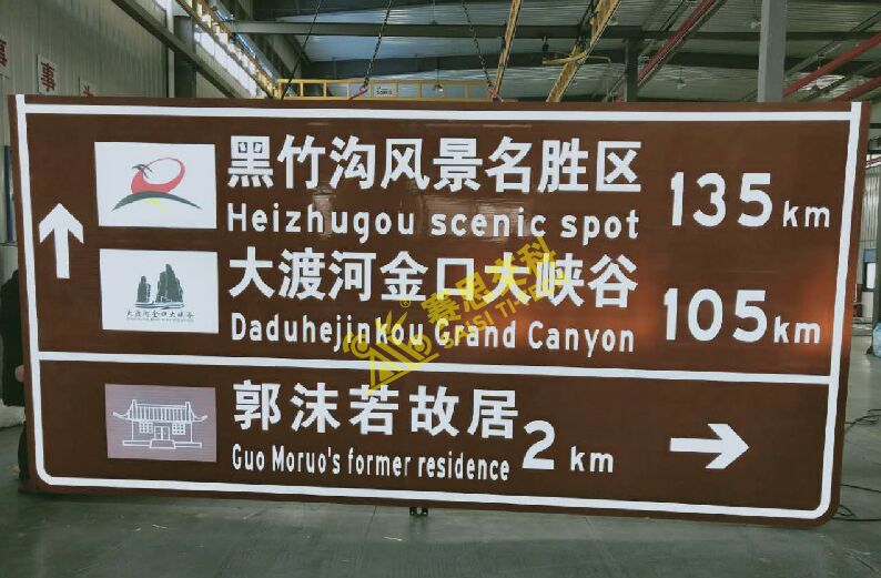 采用主動發(fā)光工藝的旅游標志牌,其版面通常由:風景點名稱文字、預告距離、引導方向箭頭、風景區(qū)圖片LOGO等組成,標志底板采用棕色反光膜(旅游標志專用膜)。標志主動發(fā)光工藝,采用內置光源定向投射標志面板,形成自主發(fā)光的效果。其優(yōu)點主要有: