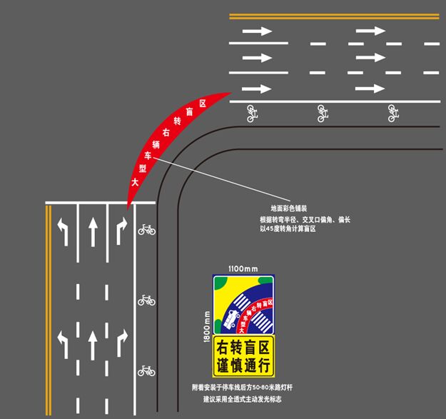 穿村鎮(zhèn)公路,不同于市區(qū)道路,肯定是在物流線路規(guī)劃區(qū)域內(nèi),貨車(chē)流量必然有所分布,而貨車(chē)駕駛存在一個(gè)最大的操作性隱患,即:“大貨車(chē)右輪視距盲區(qū)”,這類(lèi)專(zhuān)題,很多專(zhuān)業(yè)論文及“公眾號(hào)”都有專(zhuān)文闡述,此處不在詳述。推薦部分發(fā)光標(biāo)志版面如下: