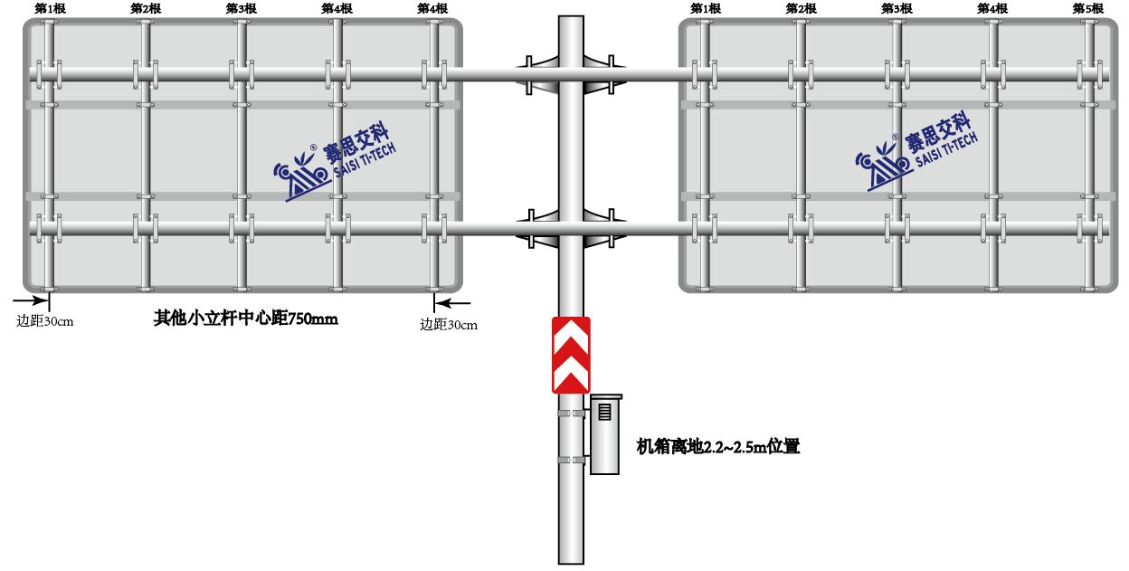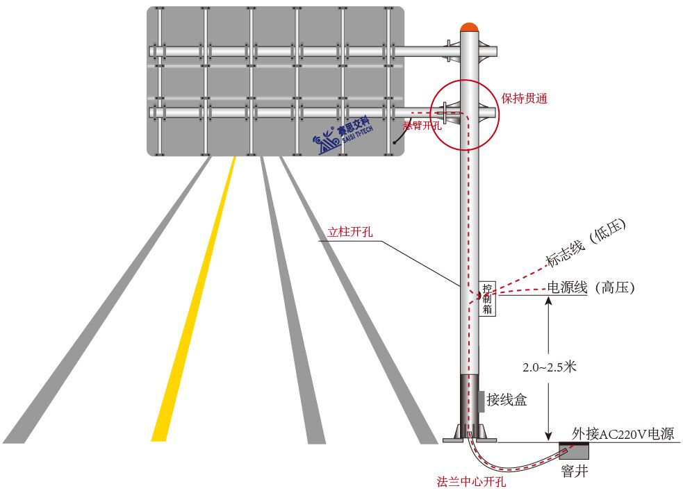 (3)安裝控制機(jī)箱。首先正確選擇待安裝標(biāo)志所對(duì)應(yīng)的機(jī)箱,不同標(biāo)志對(duì)應(yīng)不同機(jī)箱(因機(jī)箱最大承受負(fù)載不同,在機(jī)箱上貼有對(duì)應(yīng)標(biāo)志版面),不得隨意混雜機(jī)箱使用。新建桿件應(yīng)按下圖所示開(kāi)孔,讓管線在桿件內(nèi)部;控制箱安裝于路外一側(cè),離低高度約為2.2~2.5米,此高度,單人無(wú)法夠著;若有故障需檢修時(shí),人字梯也方便檢修。