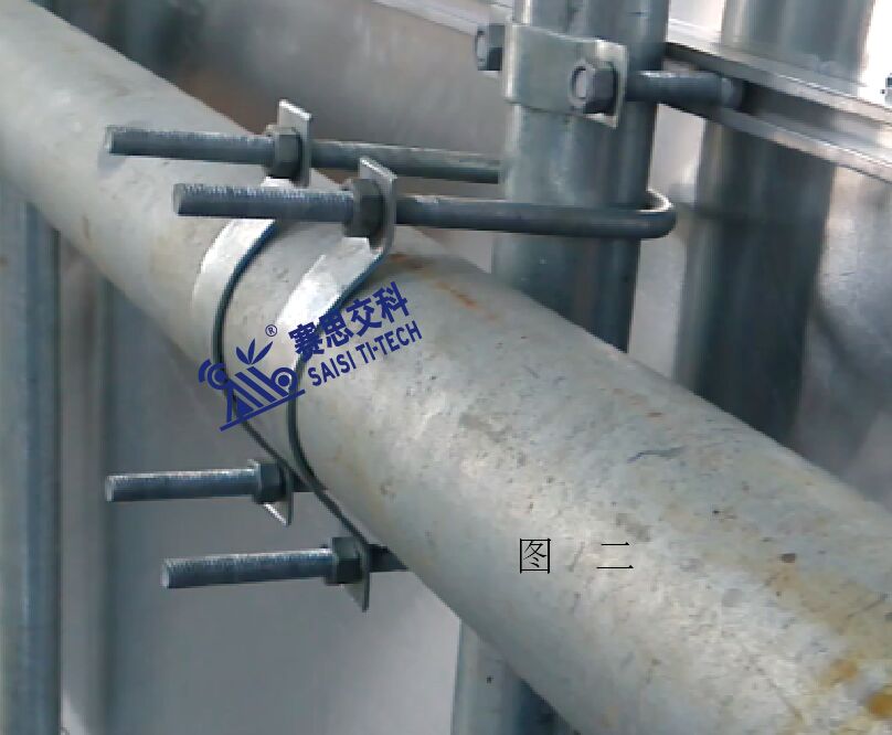 (2)將小圓管固定在懸臂上。用兩只U型卡,如圖下圖所示,安裝于懸臂桿的上下,一端套在小圓管上,一端上下貼在懸臂上,用懸臂對(duì)應(yīng)尺寸的半片抱箍,在外側(cè)固定。(注:擰螺絲時(shí),先不要一步擰緊到位,略緊即可,待全部抱箍、U型卡安裝到位后,檢查無(wú)誤時(shí),再最終擰緊加固;有誤時(shí),方便調(diào)整、修正。)