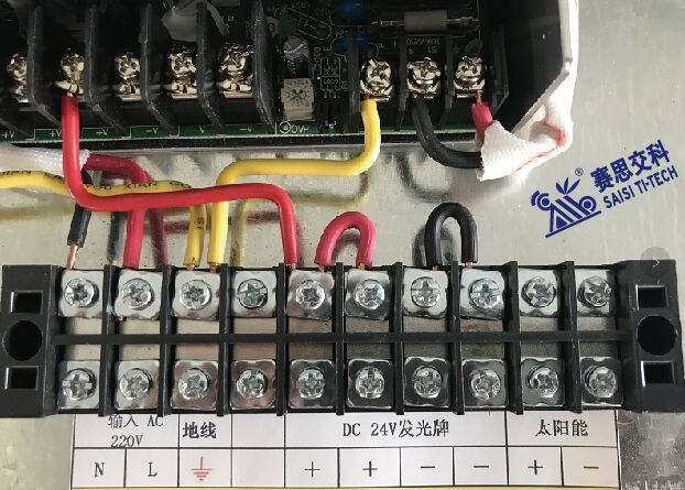 (4)控制線接電。本操作必須為持證的專業(yè)電工??!標(biāo)志牌背面出1根2芯電纜線,內(nèi)部工作電壓為DC24V,注意區(qū)分電線的正負(fù)極(具體供貨隨附的《安裝說(shuō)明書(shū)》會(huì)詳細(xì)列明),將這兩根線接入"DC發(fā)光標(biāo)志牌"所示接線端子上,嚴(yán)謹(jǐn)接入旁邊的高壓區(qū)??!接線板如下圖所示。將“空開(kāi)”按鍵下拉至“關(guān)閉”狀態(tài) ,再將市電接線接入左側(cè),輸入AC220V的接線端子,在開(kāi)啟電源前,先檢查以下接線,確保準(zhǔn)確無(wú)誤后,方可開(kāi)啟電源。注:控制系統(tǒng)為自動(dòng)光控(白天不亮,夜晚自動(dòng)開(kāi)啟),白天安裝時(shí),需測(cè)試,可用黑色物蓋在控制箱的光敏端子上,模擬夜晚效果。
