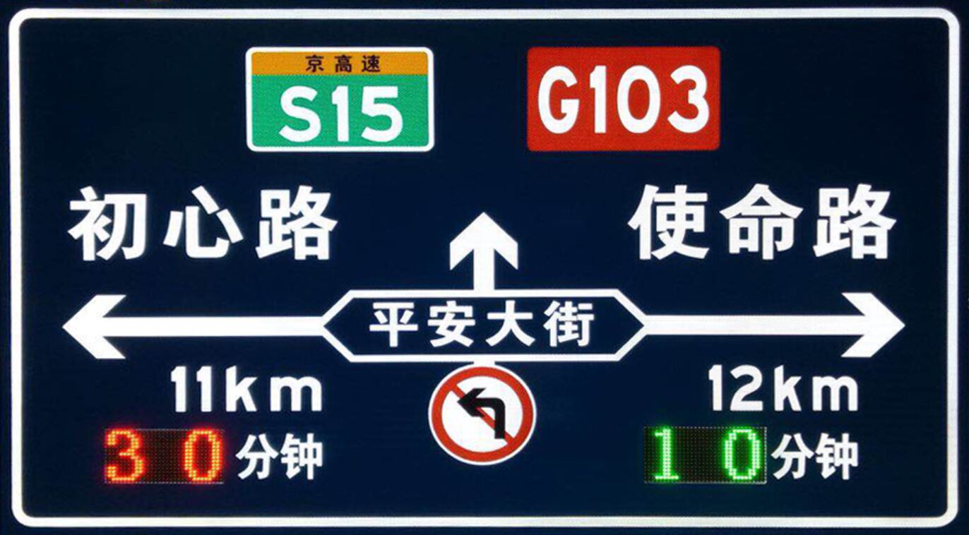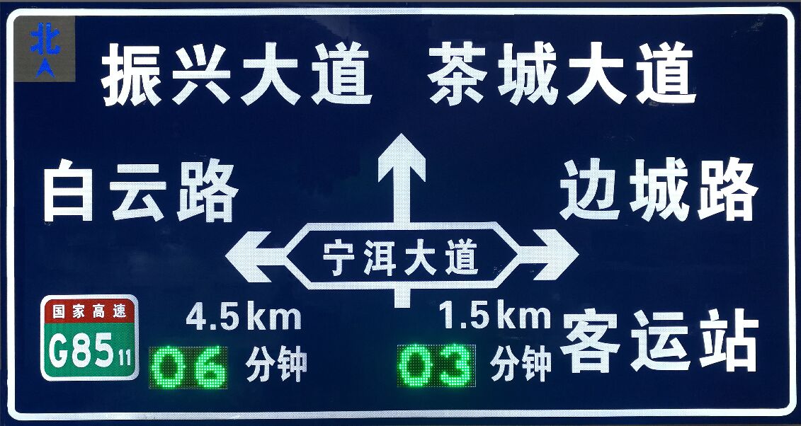 將標志安裝點位與重要節(jié)點的距離長度、到達預估時間有效統(tǒng)一在標志版面中,給機動交通參與者提供時間、空間的實時數(shù)據(jù)參考,及時改善行車預期軌跡,為交通管理部門緩解交通擁堵,合理分配區(qū)域交通流,提供有效的宏觀規(guī)劃。