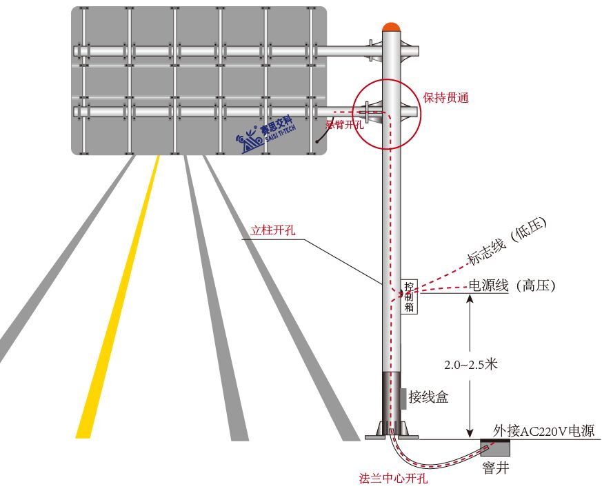 (3)安裝凈空安全。主動(dòng)發(fā)光標(biāo)志的安裝凈空應(yīng)滿足《道路交通標(biāo)志和標(biāo)線》之道路交通標(biāo)志(GB5768.2-2022)的技術(shù)要求,通常,懸臂類大型標(biāo)志,其凈空不得小于5.0米,以防車輛刮蹭;路側(cè)小型標(biāo)志,其凈空不得小于2.2米,以防行人碰頭。因特殊原因,需入侵建筑界限內(nèi)的標(biāo)志設(shè)施,應(yīng)當(dāng)配置必要的反光、發(fā)光警示設(shè)施,加強(qiáng)遠(yuǎn)距離警示。