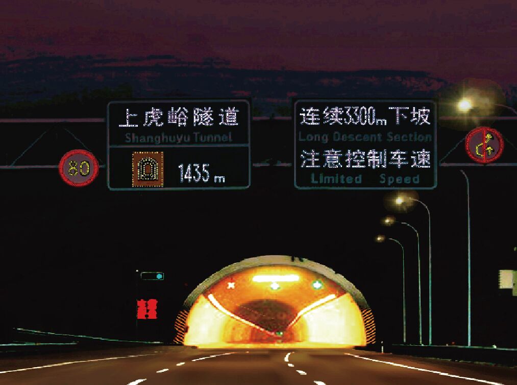 因此,在有條件的情況下,隧道及進(jìn)出路段所有交通標(biāo)志均宜采用Ⅴ類大廣角反光膜,或者采用主動發(fā)光型交通標(biāo)志,以提升交通標(biāo)志的遠(yuǎn)距離、大角度、全天候視認(rèn)功能,并通過科學(xué)、合理地增設(shè)基礎(chǔ)交通安全設(shè)施,消除特殊交通環(huán)境所衍生的安全隱患,提高隧道內(nèi)行車安全、秩序和通行效率,降低交通事故發(fā)生率,保證整個運(yùn)輸系統(tǒng)的健康運(yùn)行。