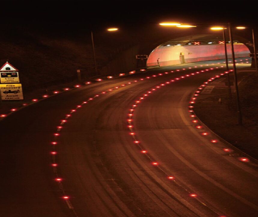 3、對于彎曲隧道路段應(yīng)設(shè)置必要的視線誘導(dǎo)設(shè)施,如主動發(fā)光誘導(dǎo)設(shè)施等 。在隧道車道中心線以及兩側(cè)邊緣線上分別設(shè)置黃色與白色被動反光道釘,隧道兩壁附著主動發(fā)光輪廓標(biāo),提示駕駛?cè)藢ο蜍嚨酪约八淼缐Ρ诘恼鎸?shí)位置,消除緊張心理。