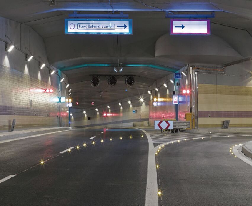 4、在隧道車道中心線以及兩側(cè)邊緣線上分別設(shè)置黃色與白色被動反光道釘,隧道兩壁附著主動發(fā)光輪廓標(biāo),提示駕駛?cè)藢ο蜍嚨酪约八淼缐Ρ诘恼鎸?shí)位置,消除緊張心理。