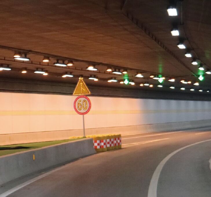5、建議在進(jìn)入隧道入口通道及前方地面設(shè)置彩色熱熔預(yù)成型落地限速標(biāo)志,落地標(biāo)志上采用圖案和文字提示不同種類的車輛行駛方向,顏色均采用標(biāo)準(zhǔn)的交通色。彩色熱熔預(yù)成型落地標(biāo)志與交通標(biāo)志形成立體的交通指引模式。