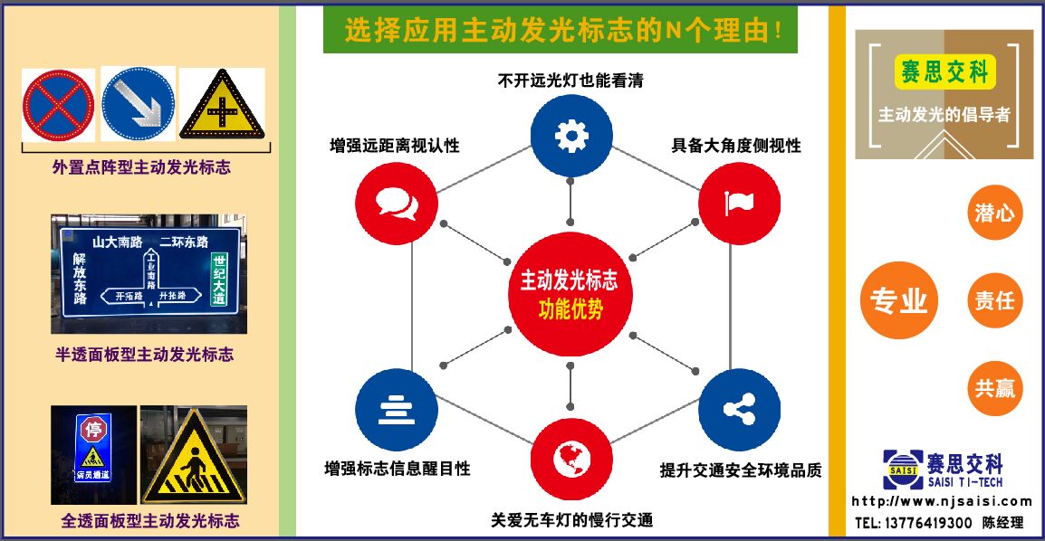 南京賽思交通信息科技有限公司,是一家專業(yè)從事交通安全研究、創(chuàng)新型交安設(shè)施研發(fā)的科技型公司,我公司研發(fā)、生產(chǎn)、銷售的主動發(fā)光標(biāo)志系列產(chǎn)品,已在全國各地的交通安全工程中廣泛使用,并在交通穩(wěn)靜化的提示、警示、管理方面取得了良好的功能效果,更多了解交通安全技術(shù)方案、創(chuàng)新交通安全產(chǎn)品,可登錄本網(wǎng)站www.hd3c.com查閱,或致電:陳經(jīng)理,13776419300。